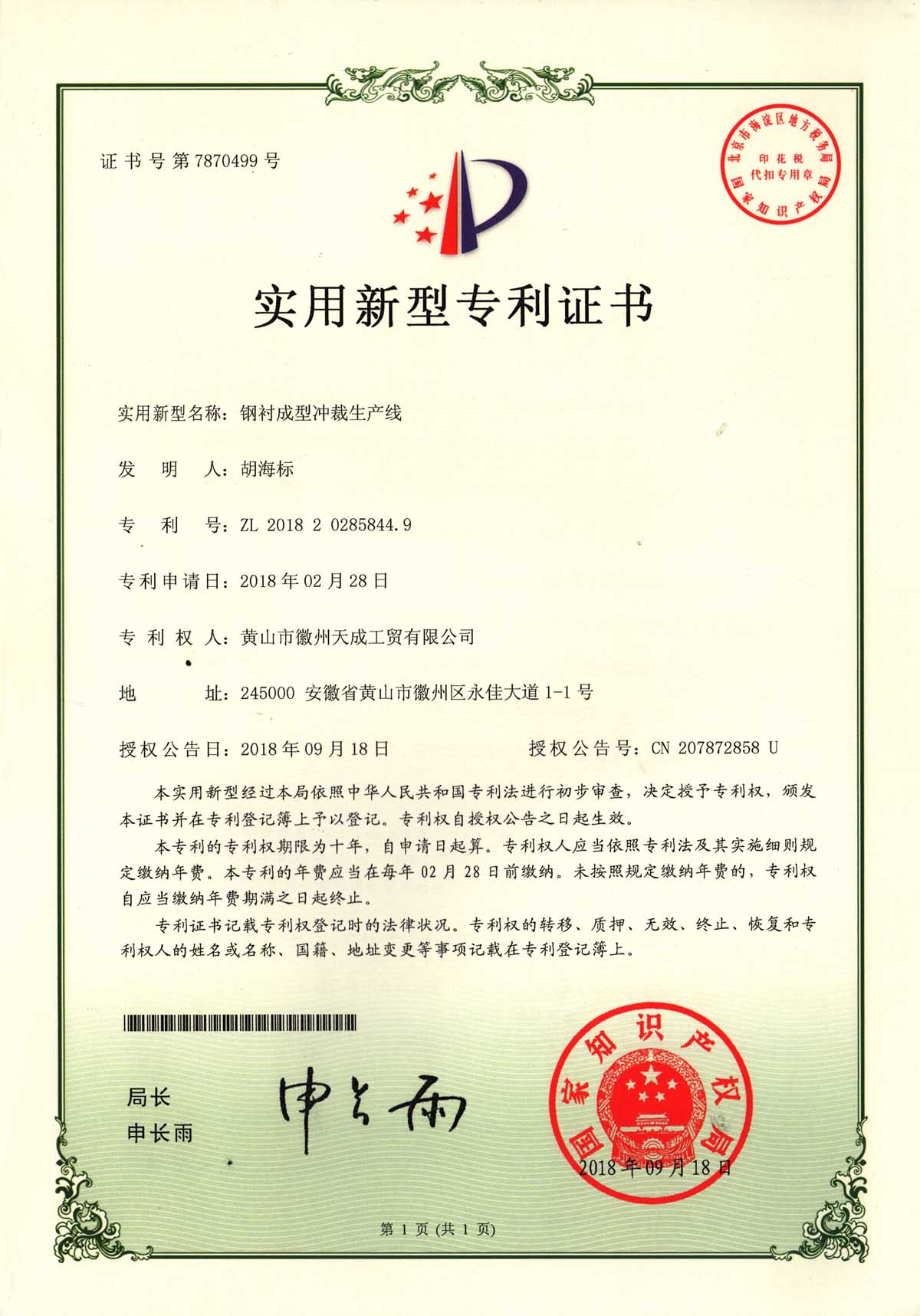 二十年來,天成人一直專注于塑鋼門窗生產(chǎn)制造,從產(chǎn)品性能到生產(chǎn)工藝,從系統(tǒng)管理到設(shè)備研發(fā)。其中”鋼襯成型沖裁生產(chǎn)線“就是天成自主研發(fā)的生產(chǎn)設(shè)備,并獲取了實(shí)用新型專利。