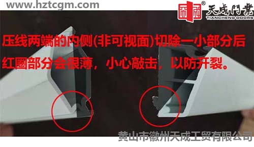 當(dāng)壓線兩端內(nèi)側(cè)切除一部分后,兩邊的尖角會(huì)比常規(guī)情況薄很多,以至于很容易開(kāi)裂,所以在放進(jìn)玻璃壓線槽之后,盡可能不要重?fù)魞删€兩端,以確保壓線表面完整美觀。